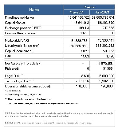 Risk quantification is carried out using technological tools such as “VaR Global”, “SIF” internal systems, together with a database that has the following sources of information: Bloomberg, Price vendor and pages for Regulatory Institutions.