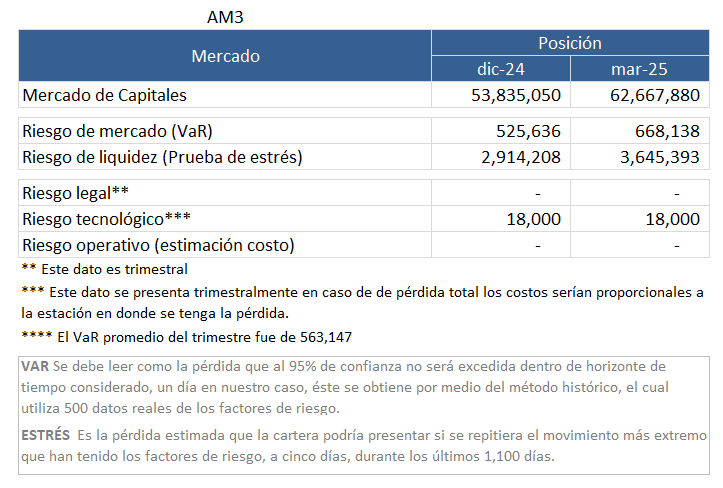 - VALOR EN RIESGO - La operadora utiliza el VaR para cuantificar su riesgo de mercado, éste se debe leer como la pérdida que al 95% de confianza no será excedida dentro de horizonte de tiempo considerado, un día en nuestro caso, este se obtiene por medio del método histórico, el cual utiliza 500 datos reales y escenarios, respectivamente.