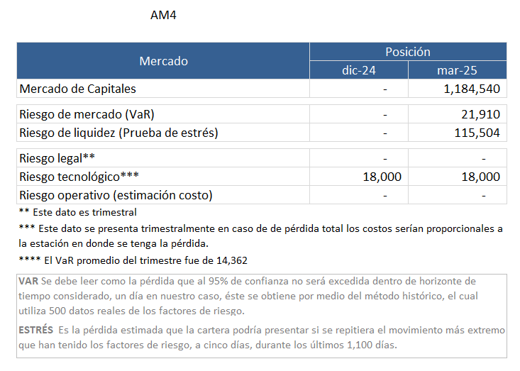 La metodología de cuantificación y medición de Riesgos de Mercado se basa en cuatro procesos:- VALOR EN RIESGO - La operadora utiliza el VaR para cuantificar su riesgo de mercado, éste se debe leer como la pérdida que al 95% de confianza no será excedida dentro de horizonte de tiempo considerado, un día en nuestro caso, este se obtiene por medio del método histórico, el cual utiliza 500 datos reales y escenarios, respectivamente.