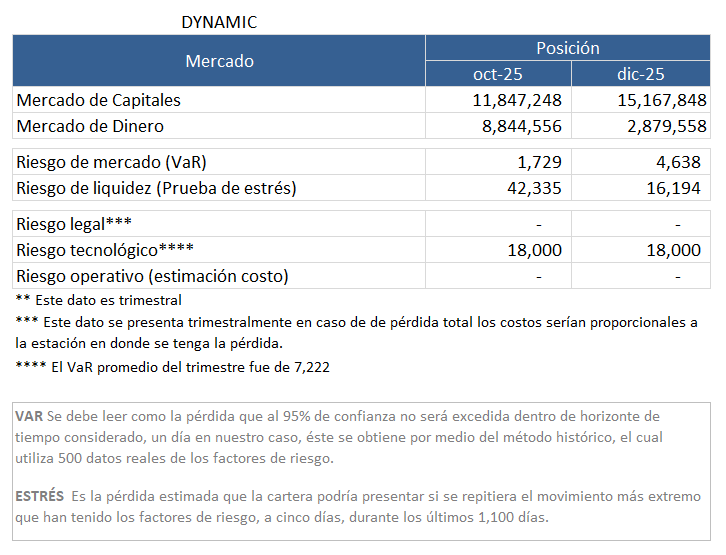 La metodología de cuantificación y medición de Riesgos de Mercado se basa en cuatro procesos:- VALOR EN RIESGO - La operadora utiliza el VaR para cuantificar su riesgo de mercado, éste se debe leer como la pérdida que al 95% de confianza no será excedida dentro de horizonte de tiempo considerado, un día en nuestro caso, este se obtiene por medio del método histórico, el cual utiliza 500 datos reales y escenarios, respectivamente.
